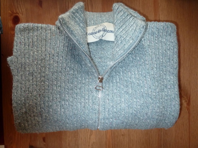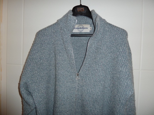 Taille XL Couleur : gris 50% laine et 50% acrylique Dimensions : Largeur 60cm / Longueur 71cm (+col de 8cm) Largeur d'épaule à épaule : 62cm Longueur des manches : 55cm